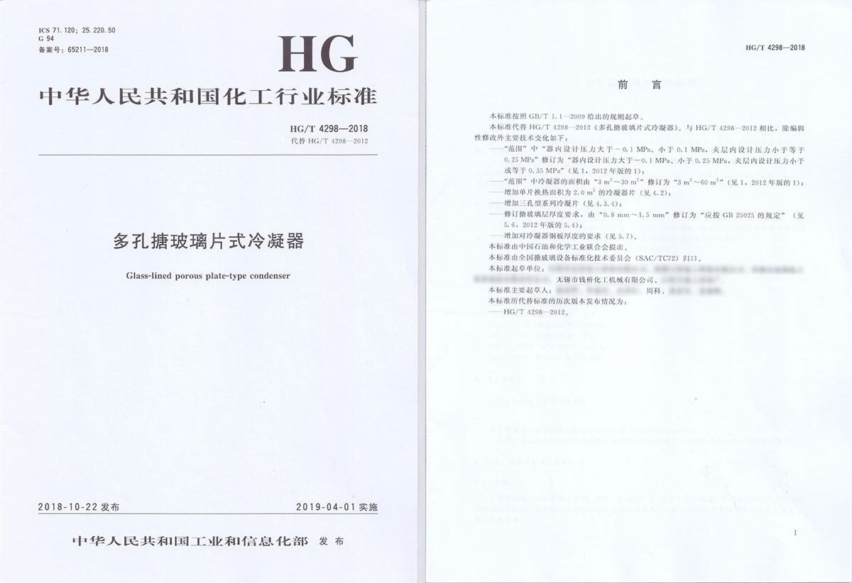 無錫錢橋化工機械有限公司參與起草中華人民共和國化工行業(yè)標準HG/T 4298-2018《多孔搪玻璃片式冷凝器》。