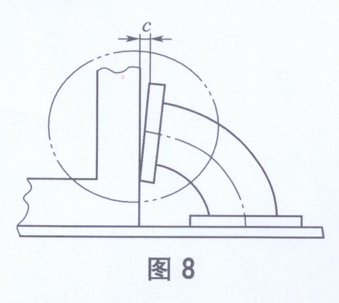 將被測(cè)管件(彎頭)法蘭一端放置在平臺(tái)上,緊貼另一端法蘭面處放專用直角尺(如圖8所示),長(zhǎng)邊比管件(彎頭)法蘭外徑最高處稍長(zhǎng),用塞尺量取法蘭外徑最高處與直角尺長(zhǎng)邊的最大距離c,此值即為管件(彎頭)法蘭對(duì)(另一側(cè))法蘭的垂直度。