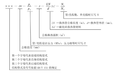碳化硅換熱器設(shè)備型號由結(jié)構(gòu)型式、公稱直徑、設(shè)計壓力、公稱換熱面積、公稱長度、換熱器外徑、管/殼程數(shù)、管束等級等字母代號組合表示。
