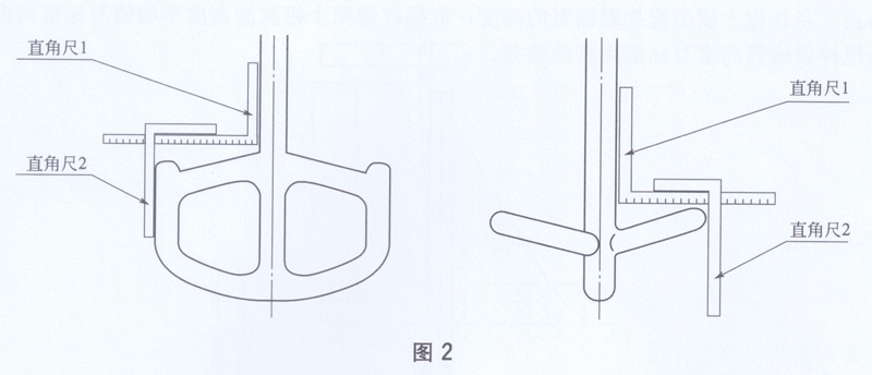 將待測攪拌器放平或豎直,如圖2所示,直角尺1的一邊貼靠在攪拌器上,另一邊與直角尺2的一邊平行貼靠,直角尺2的一邊觸碰到錨翼的端部,在直角尺1上讀取錨翼寬度值(這個(gè)值應(yīng)為錨翼端部距攪拌器軸面的最小值)。在攪拌器的另一錨翼做相同測量。對稱錨翼的錨翼寬度最大值與最小值的差為攪拌器錨翼對稱度。