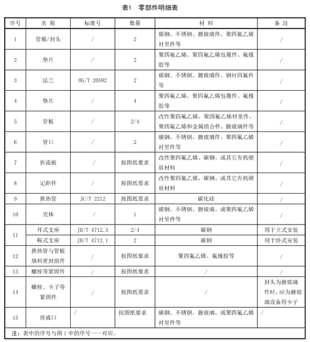 碳化硅換熱器結(jié)構(gòu)型式見圖1,零部件明細(xì)表見表1,換熱器主要尺寸標(biāo)注圖見圖2,主要尺寸表見表2,管口尺寸表見表3,換熱器(換熱管外徑為Φ14 mm)的布管數(shù)及換熱面積表見表4,換熱器(換熱管外徑為Φ19 mm)的布管數(shù)及換熱面積表見表5。