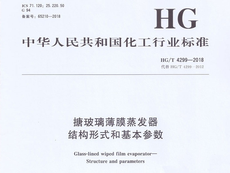 無錫錢橋化工機械有限公司參與起草中華人民共和國化工行業(yè)標準HG/T 4299-2018《搪玻璃薄膜蒸發(fā)器結(jié)構(gòu)形式和基本參數(shù)。 ...