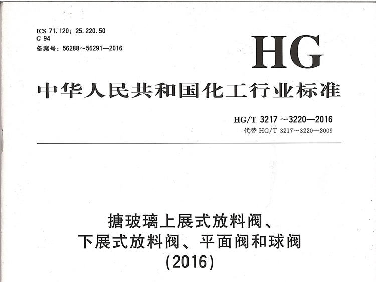 中華人民共和國化工行業(yè)標準之HG/T3217~3220-2016搪玻璃上展式放料閥、下展式放料閥、平面閥和球閥(2016),無錫市錢橋化工機械有限公司為本標準起草單位之一。 ...